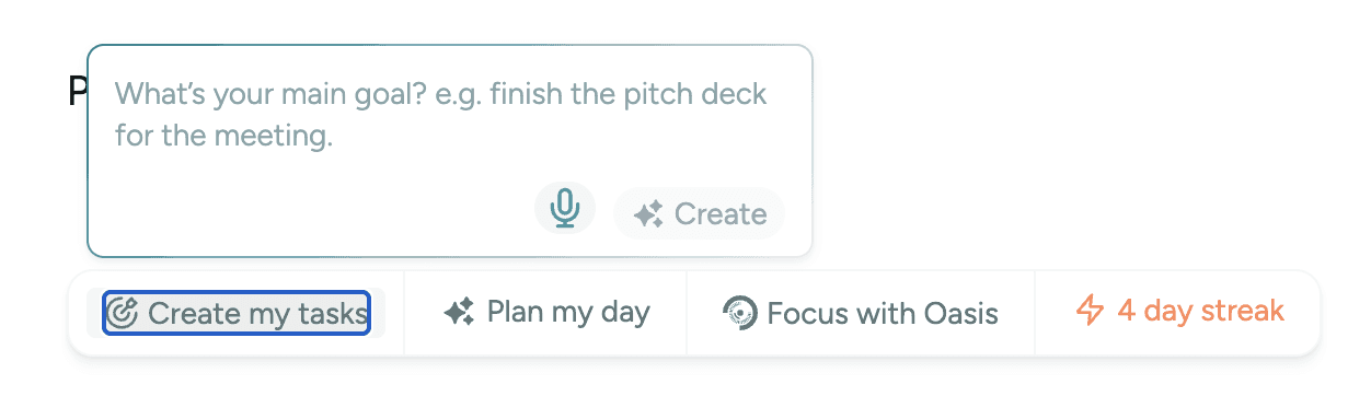 We’re thrilled to introduce a whole new way to structure your day! Now, with our AI-powered feature, you can transform your goals into to-dos, create a complete schedule, and focus deeply with Oasis – giving your day the structure it deserves from start to finish. Scroll down to explore this and more!
