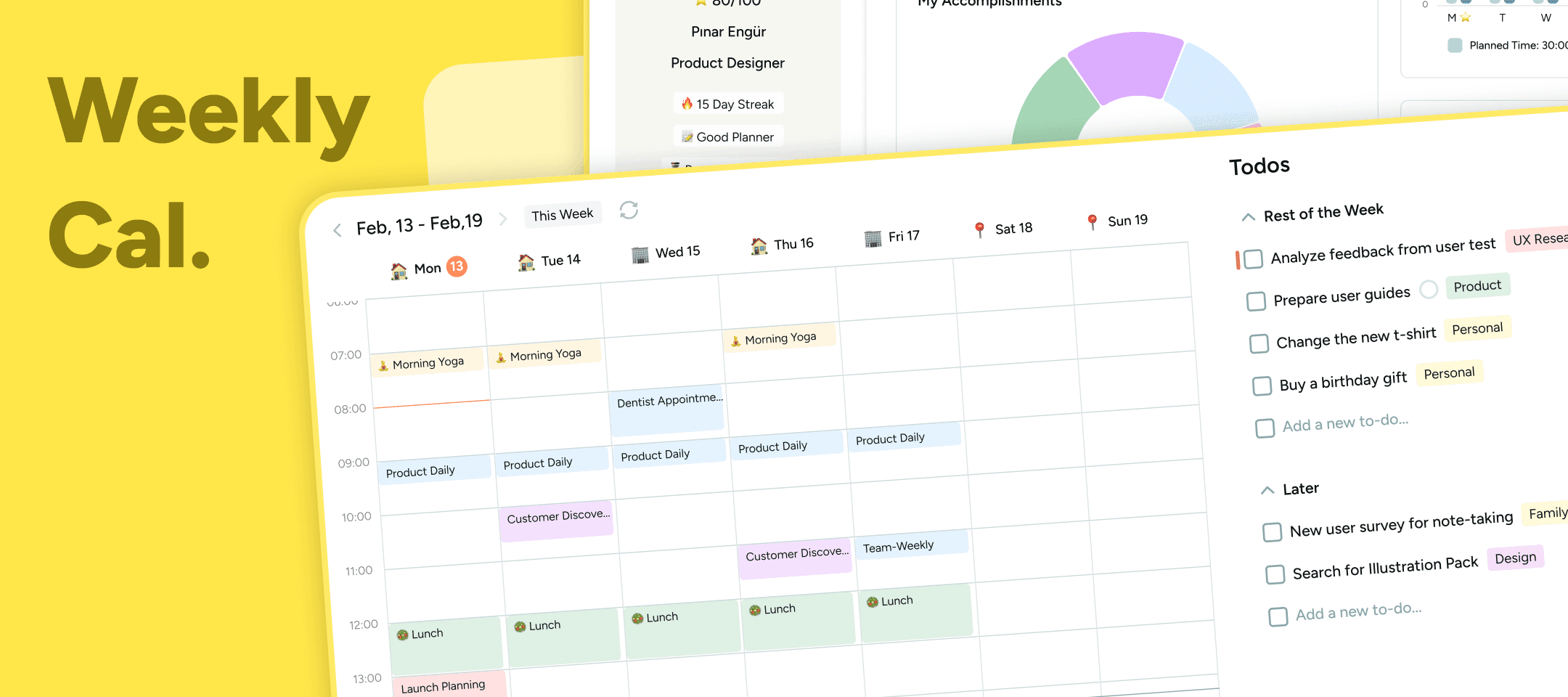 Track your weekly accomplishments, monitor moods, keep an eye on your total tracked time, and understand your to-dos distribution throughout the week. It's designed to provide valuable insights into your weekly performance.