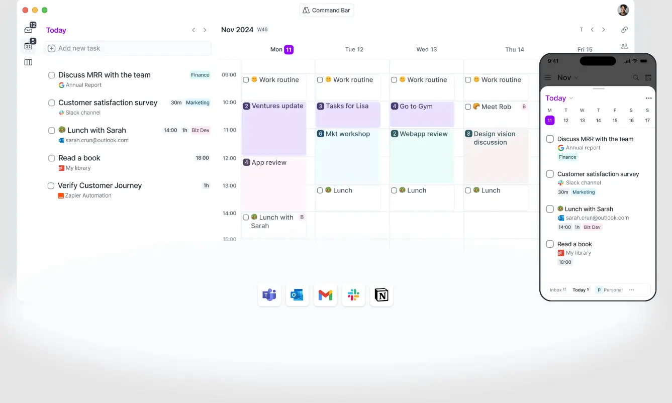 Akiflow: Excels in command bar navigation and calendar event integration.