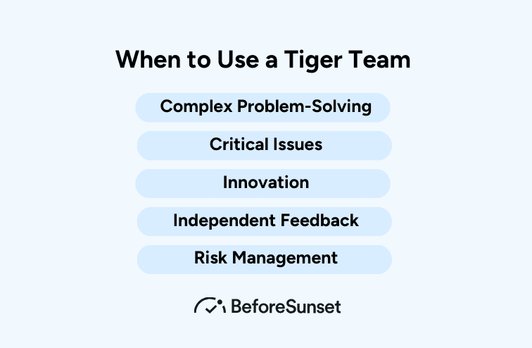 Tiger Teams can be deployed in various scenarios. They're your go-to resource when dealing with high-stakes, time-sensitive situations, as well as when you're in pursuit of fresh and innovative solutions. Here are a few examples: