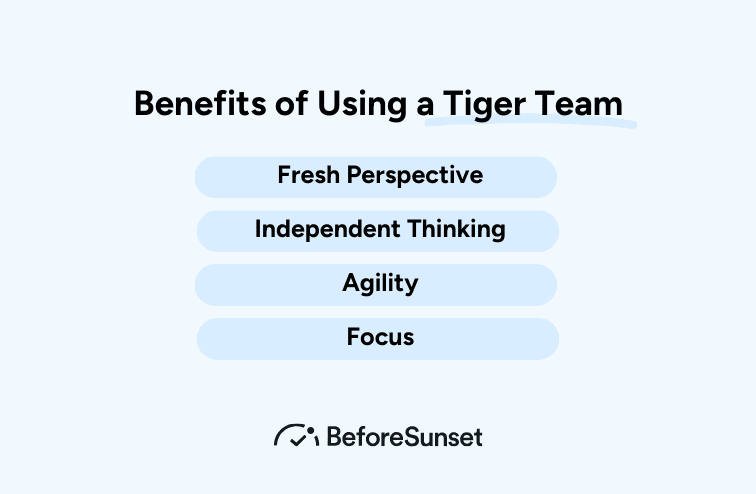 Fresh Perspective: Comprising individuals from different areas of your organization, Tiger Teams bring a fresh, diverse perspective to problem-solving.