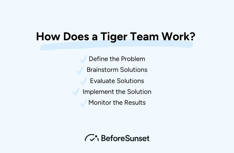 5. Monitor the Results: Post-implementation, the Tiger Team closely monitors the results to ensure the desired effect is achieved. Adjustments or new solutions may be necessary.